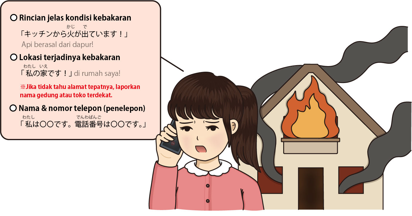 Saat terjadi kebakaran atau ketika kamu melihat adanya kebakaran, penting untuk tidak menanganinya seorang diri, tetapi segera memberi tahu orang-orang di sekitar dengan suara lantang. Segeralah menghubungi nomor 119 dan dan mintalah shōbōsha (消防車; mobil pemadam kebakaran) dari shōbōsho (消防署; dinas pemadam kebakaran). Layanan pelaporan kepada dinas pemadam kebakaran dapat dilakukan secara gratis selama 24 jam sehari, 365 hari dalam setahun.