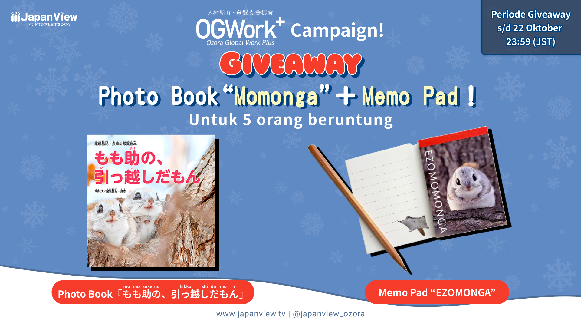 Kali ini, 5 pemenang beruntung akan mendapatkan paket spesial berisi photo book “Momoke no, Hikkoshi da mon”, yang menceritakan kehidupan musim dingin Ezo momonga (tupai terbang) dengan mata besar yang lucu, beserta memo pad. Buku ini menampilkan kelucuan Momonga sekaligus indahnya salju Hokkaido, menjadikannya pengalaman khas Jepang yang menyenangkan untuk dinikmati.