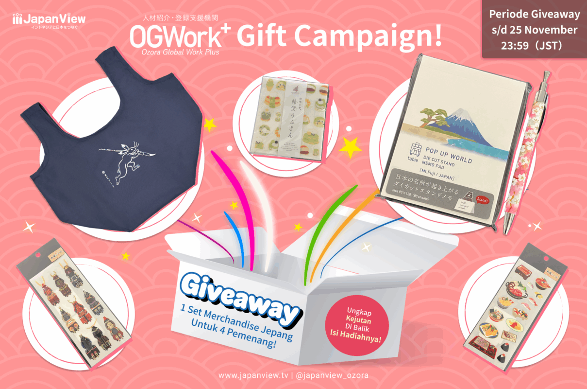 Ini merupakan Giveaway ke-7 dari OGWork+ (Oozora Global Work Plus), perusahaan yang memperkenalkan tenaga kerja dengan Status Keahlian Khusus (Tokutei Ginou) yang mengoperasikan ‘Japan View’! Kami akan memberikan total 4 hadiah berupa merchandise khas Jepang, seperti eco bag yang bisa dilipat, serta set memo stand bertema Gunung Fuji dan pulpen bermotif sakura.