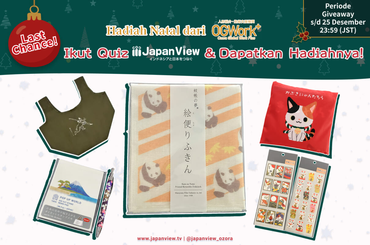 Program giveaway yang diselenggarakan oleh Ozora Global Work Plus (OGWork+), perusahaan perekrutan Tokutei Ginou (tenaga kerja berketerampilan khusus) yang mengelola Japan View, akan segera berakhir! Kami akan memberikan satu set spesial yang terdiri dari beberapa kombinasi merchandise bernuansa Jepang di bawah ini kepada empat pemenang beruntung!