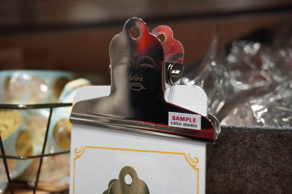 “Daibutsu Clip” dari coto mono, sebuah toko alat tulis di Prefektur Nara, menampilkan jepitan berbentuk gunung dengan wajah Buddha Agung yang tercetak di atasnya, sehingga menarik perhatian bahkan dari kejauhan.