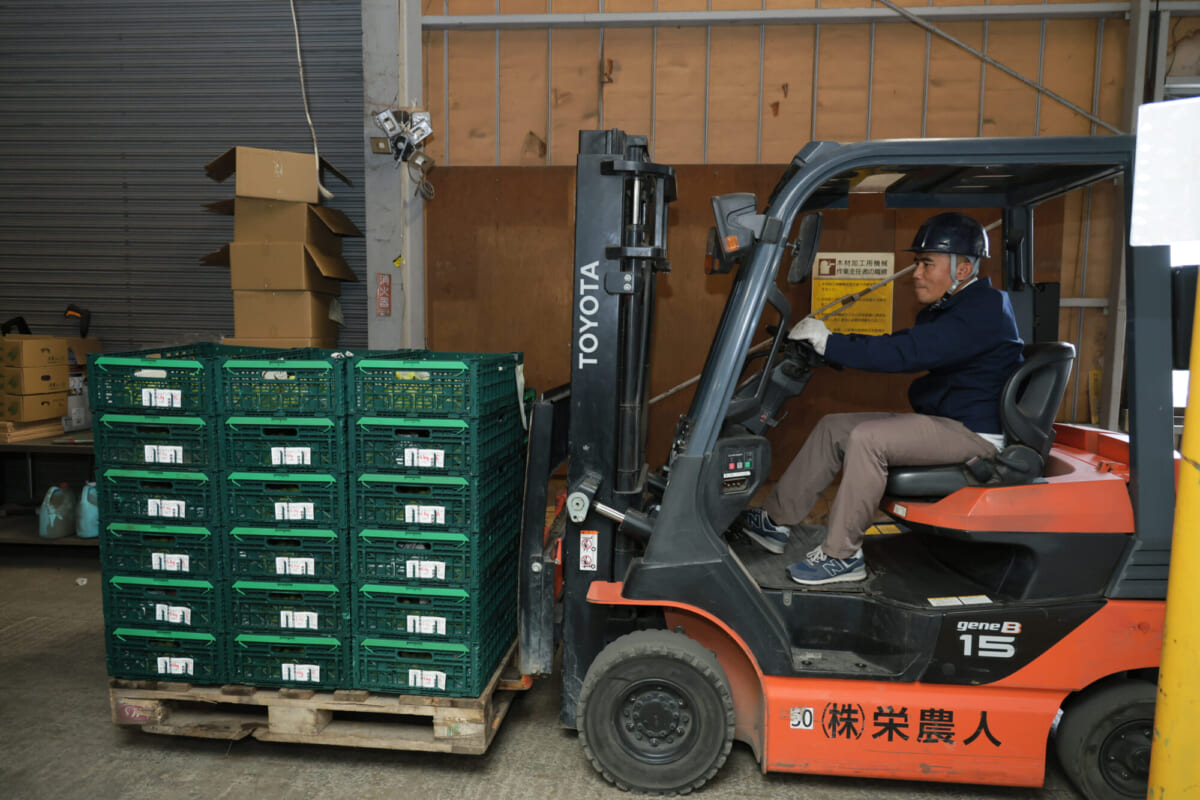 主な業務は、フォークリフトを使った農作物や資材の運搬、積み下ろし、取引先からの受注の管理など。注文が多い日や収穫が集中する時期には運搬する物資の量も増えて忙しくなるが、効率よく丁寧に作業を進めている。また、農作物の収穫がピークを迎える時期には、畑に出て収穫作業を手伝うこともある。10時・12時・15時の休憩時間にはお祈りを挟みながら、17時の退勤まで仕事に励んでいる。