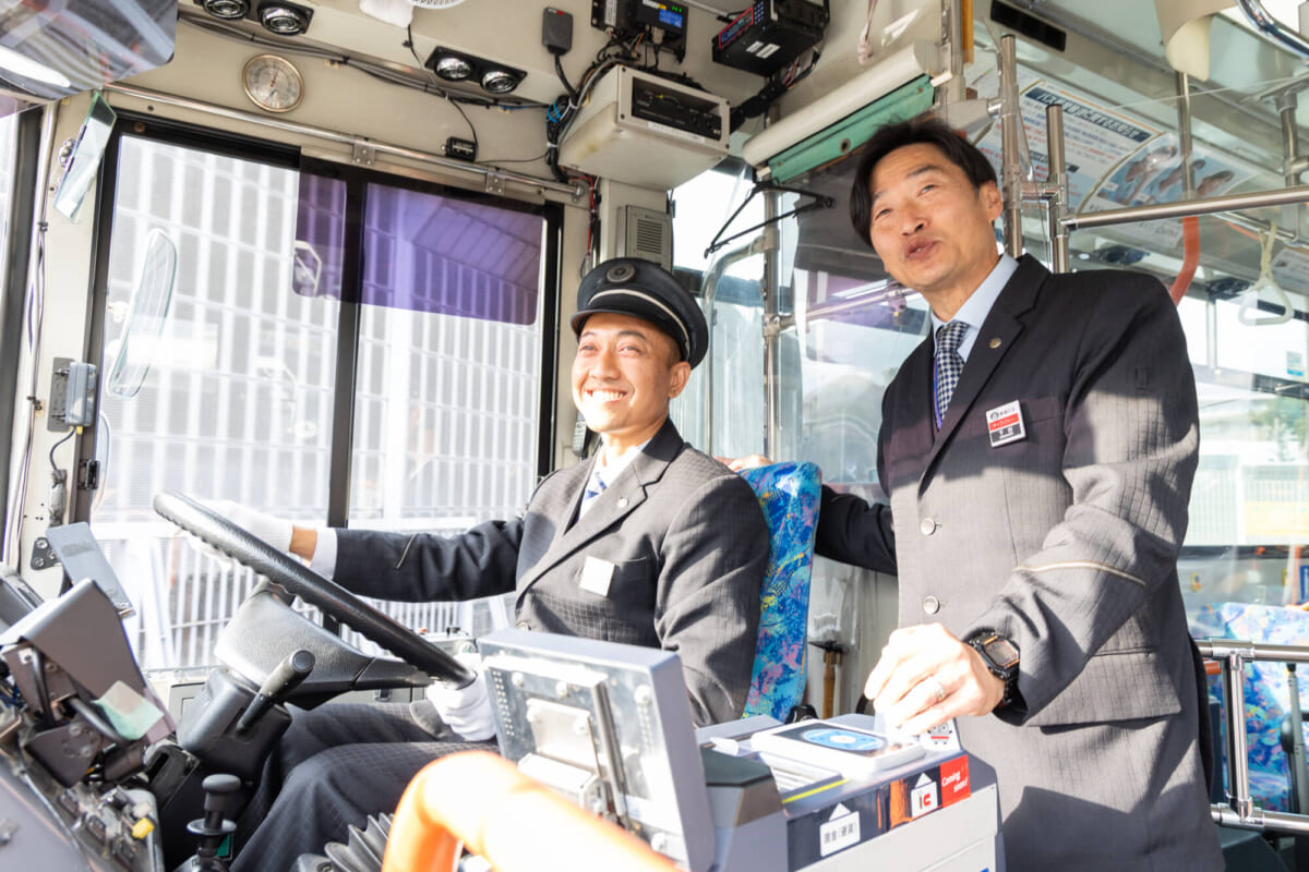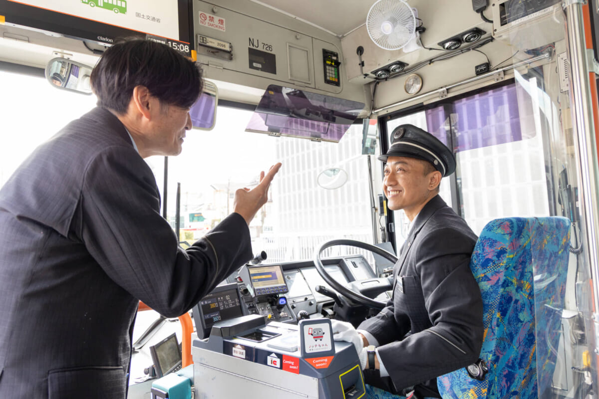 新任運転者研修がスタートしてからは、毎日9〜17時までさまざまな教習に励んできた。最終目標は、特定技能1号の要件のひとつである“運転士単独での営業運転”。バグスさんはその一歩手前の、教習を担当する運転士同乗のもと、お客さんを乗せて実際のバス路線を運転する段階に入っている。