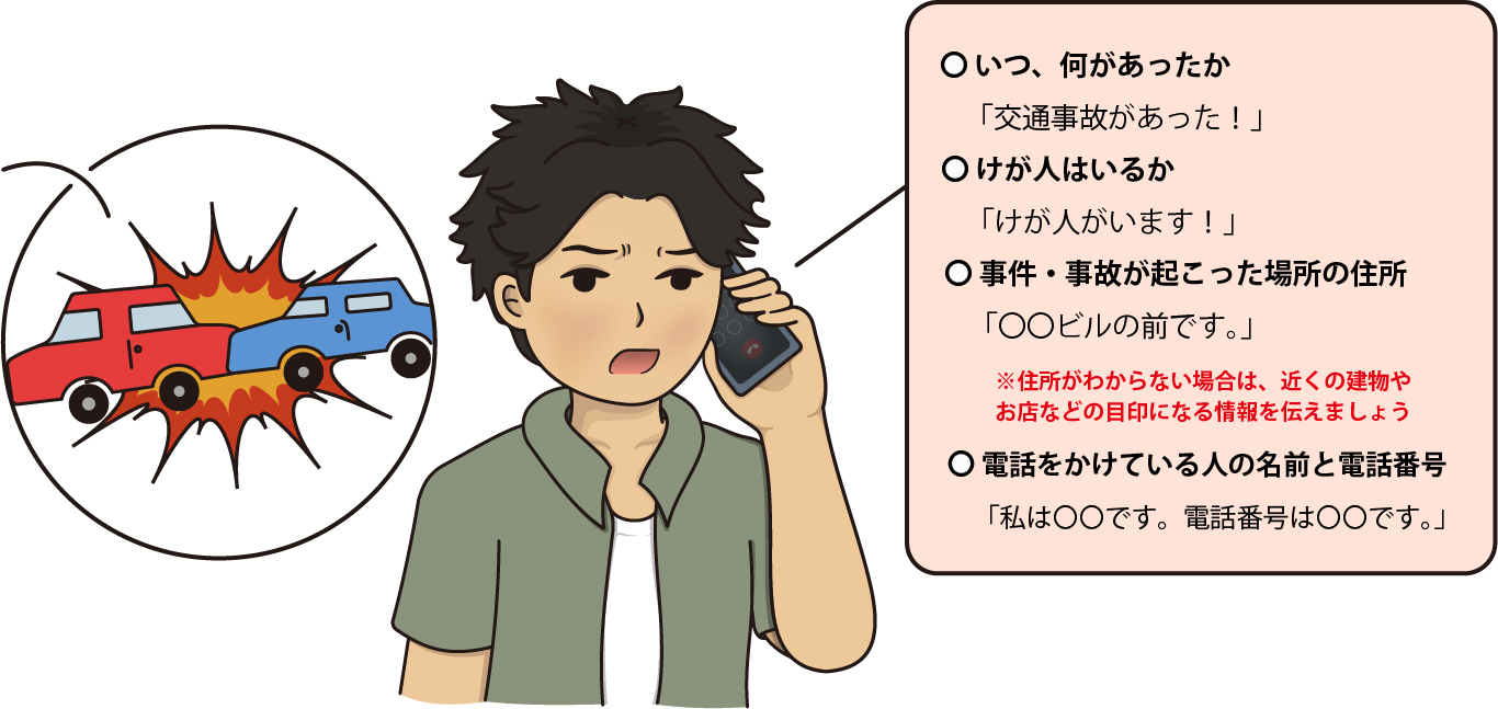 - 「110」に連絡する時は、最初に事件と事故のどちらかを伝えた後、起こったことや場所、連絡している人の名前と電話番号などをはっきりつたえましょう。