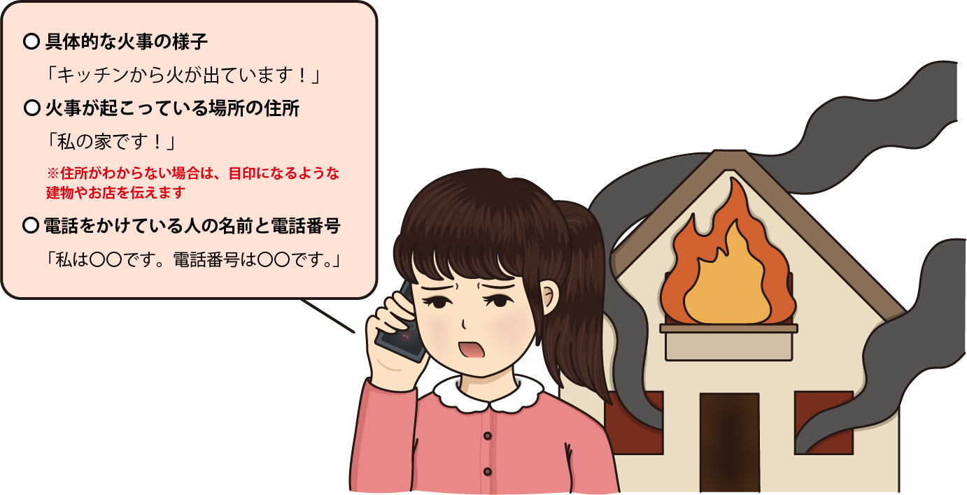 最初に「火事ですか?救急ですか?」と聞かれます。「火事です」と伝えた後、慌てず、落ち着いて、次の情報をはっきりと伝えてください。