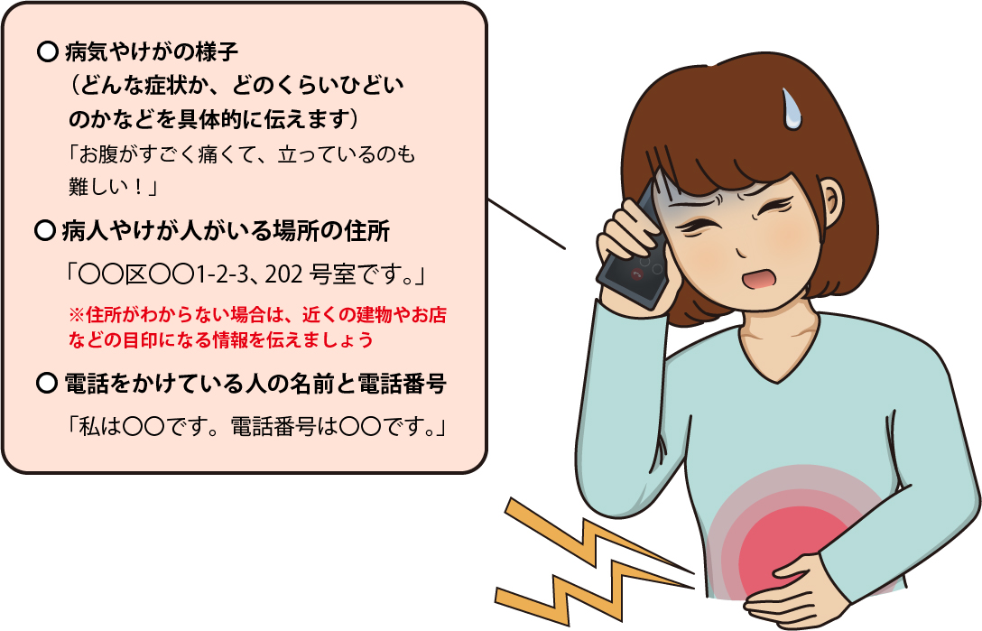 最初に「火事ですか?救急ですか?」と聞かれます。「救急です」と伝えた後、慌てず、落ち着いて、次の情報をはっきりと伝えてください。