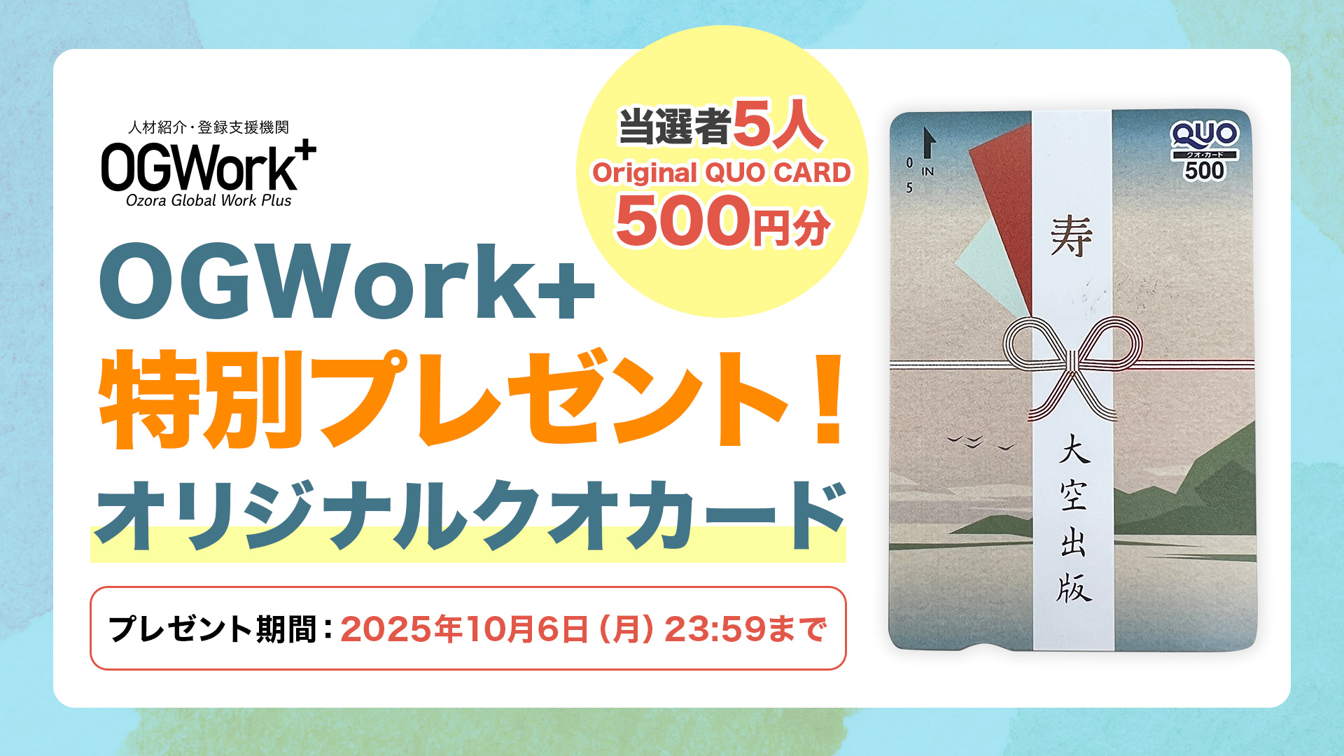 今回は、このサイトの運営を手がけるほか、特定技能人材の紹介を行う「大空グローバルワークプラス(OGWork+)」によるプレゼント企画を実施します。 当選者には、500円分のオリジナルクオカードをプレゼント!ぜひご参加ください。