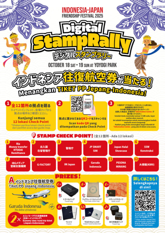 さらに、昨年に引き続き、インドネシアの往復航空券が当たるデジタルスタンプラリーも開催!会場内12ヵ所の拠点を巡ってQRコードをスキャンすると、日本~インドネシア間の往復航空券のほか、トラベルバッグやバティックスカーフなどが当たる抽選に参加できます。