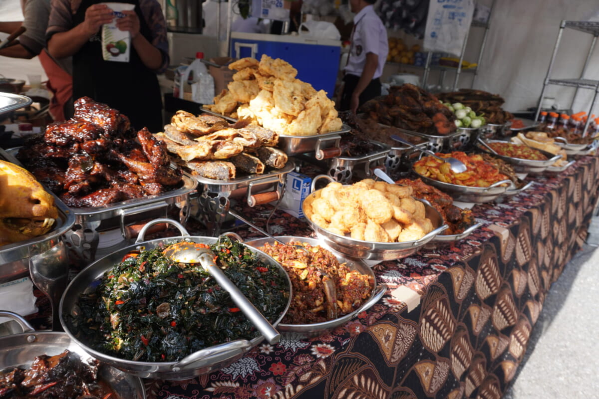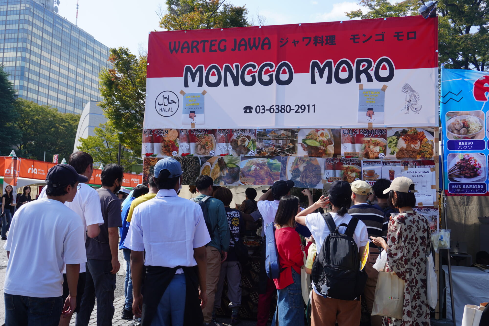 在日インドネシア人御用達の「CINTA JAWA CAFE」や、現地スタイルでジャワ料理を提供する「MONGGO MORO」は、朝10時台から行列ができるほどの人気ぶり。一方、大阪万博で話題を呼んだ「ヨヤクナシ」を歌って踊りながら集客を試みるスタッフの姿も見られました。