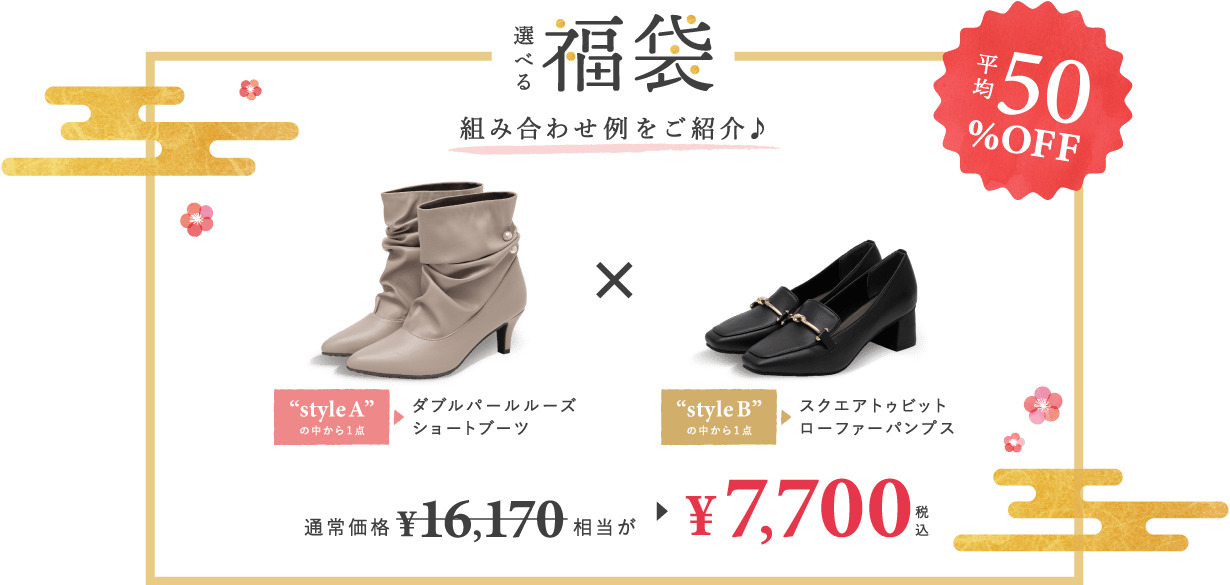 対象アイテムから好きなものを2点選べる福袋。ショートブーツやトートバッグ、マフラーなどの多彩なファッショングッズが対象です。