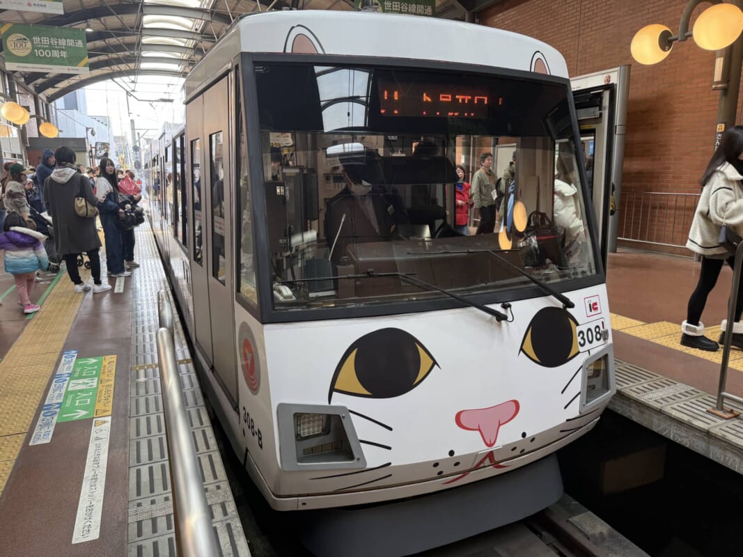 豪徳寺へ行くなら、路面電車の雰囲気が残る「東急世田谷線」の利用がお勧め!数本に一本の割合で運行している「幸福の招き猫電車」は、車体に招き猫がデザインされているだけでなく、つり革や床までまさに“猫づくし”。この特別な電車に出会えたら、あなたにも幸運が訪れるかもしれません。