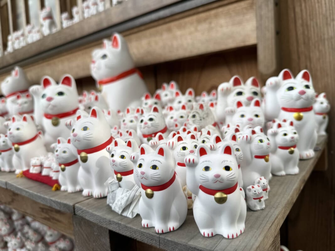 この出来事をきっかけに、幸運を招いた猫を「招福猫児(まねきねこ)」と呼んで大切に祀るようになりました。境内の「招福殿(しょうふくでん)」という建物には、願いが叶ったお礼として奉納された約1万体もの招き猫がびっしりと並んでおり、パワースポットとしても人気を集めています。