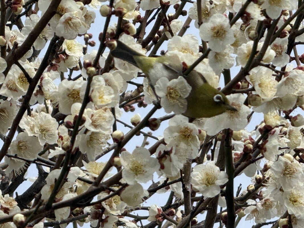 編集部が訪れた際には、春を告げる梅の花が咲いており、メジロも花の蜜を吸いにやってきていました。