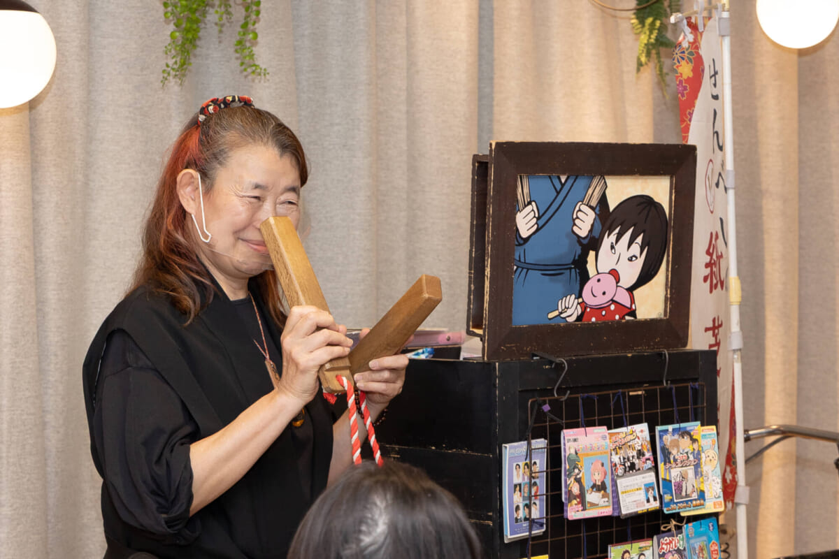 場が温まってきたところで、口演本編となるオリジナルストーリー『あの日の夕陽の日』を上演。これは、当時の自転車紙芝居の情景を描いた物語で、昭和の子どもたちにとって最大の娯楽であった紙芝居の様子を忠実に再現した作品となっています。当時を知る世代にはなつかしさを呼び起こし、外国籍の若者には未知の日本文化に触れる機会となりました。