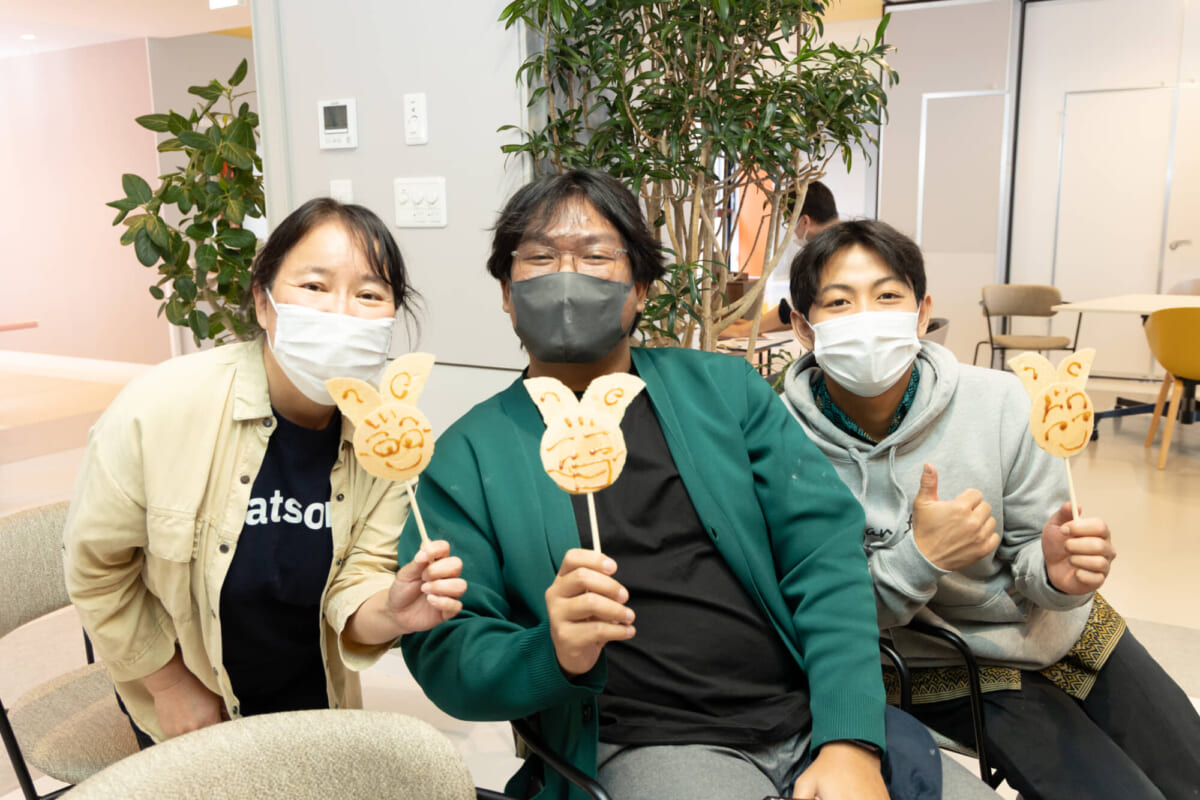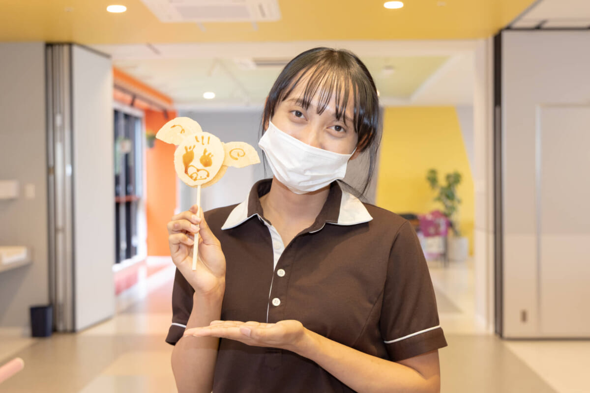 せんべいを配る際には、受け取る人の似顔絵をソースを使ってその場で描くという演出も。せんべいを受け取った人たちは、「自分の顔そっくり!」と言いながら自撮りをするなどして楽しんでいました。また、せんべいが食べられない人には、成功すると景品がもらえる“カタヌキ”が配られました。