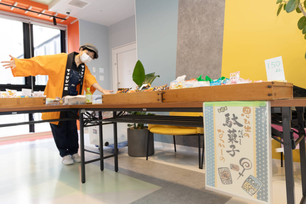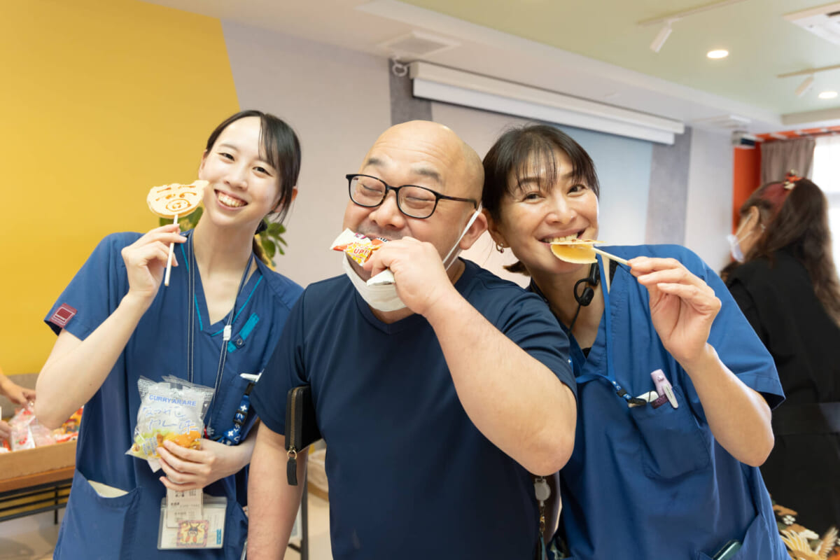 イベントの締めくくりには駄菓子の販売会も行われ、施設で働く介護スタッフを中心に「駄菓子を買いたい!」という人たちが集まりました。なつかしの駄菓子を片手に談笑する人や、「インドネシア人のスタッフに食べさせたい」と、お土産用に駄菓子をたくさん買う日本人スタッフの姿もありました。
