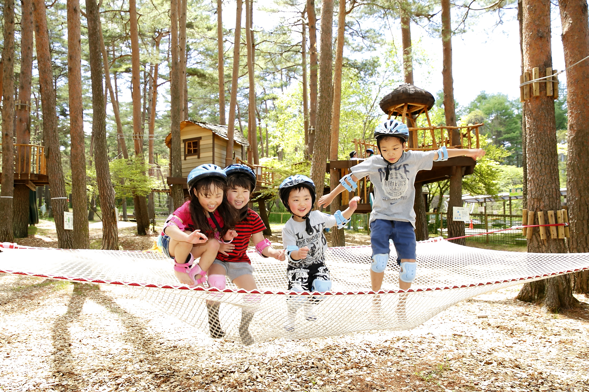 ツリーハウスやツリーデッキで遊べるアスレチックフィールドをはじめ、大自然を満喫できるアトラクションが多数